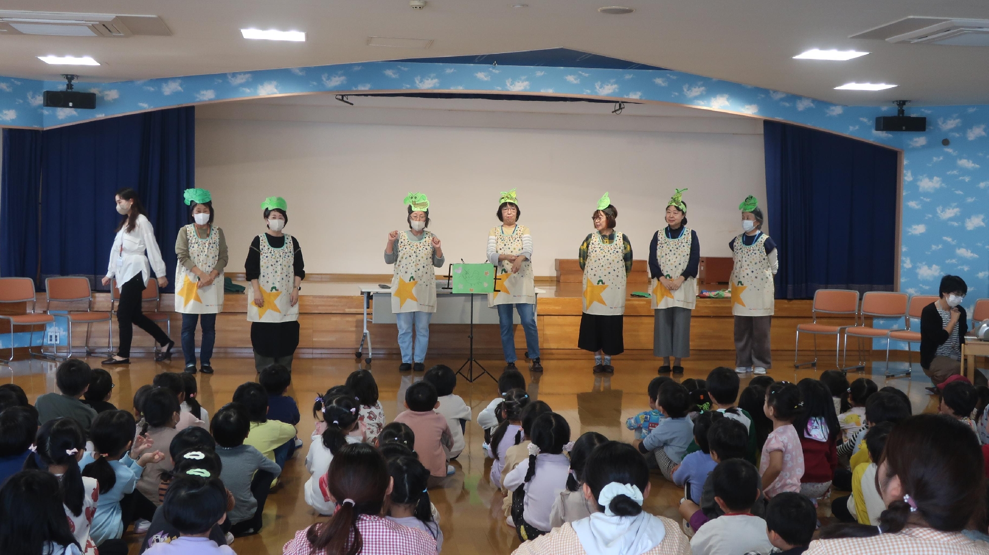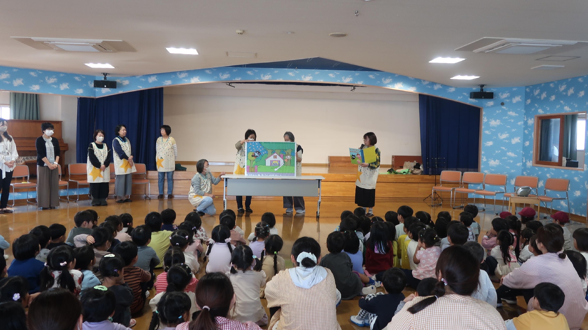 食育キャラバン隊がやってきました。食事の大切さのお話、ダンス、そしてビック紙芝居など、子供達が楽しめるしかけがたくさん! あっという間の30分でした♪