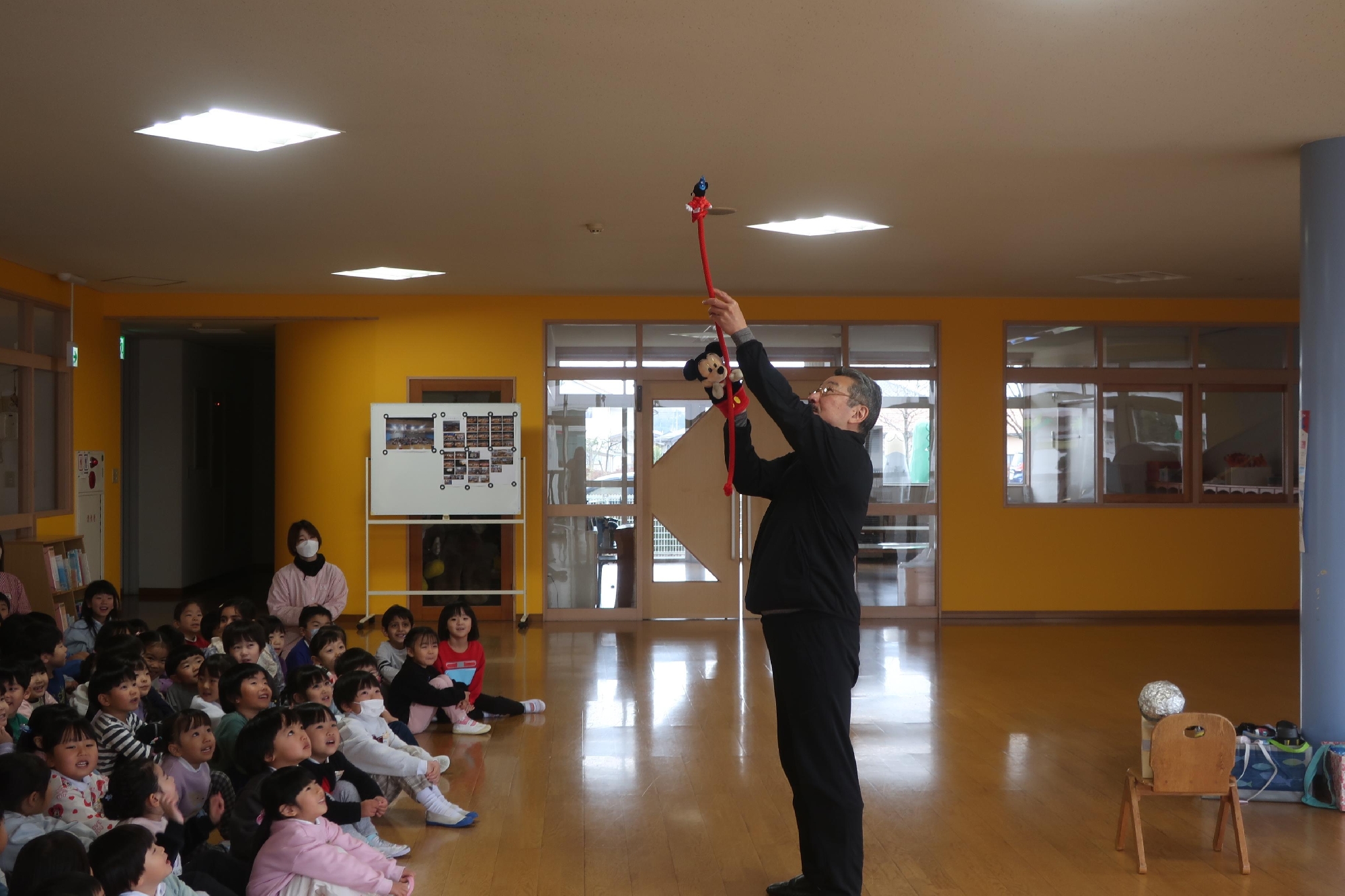 今日で2学期が終わります。明日から冬休みですが園長先生から怪我や病気に気を付ける事、お餅にも気を付けることなどお話を聞いてから、恒例になった園長先生手品! 今日は上手くいったかな?