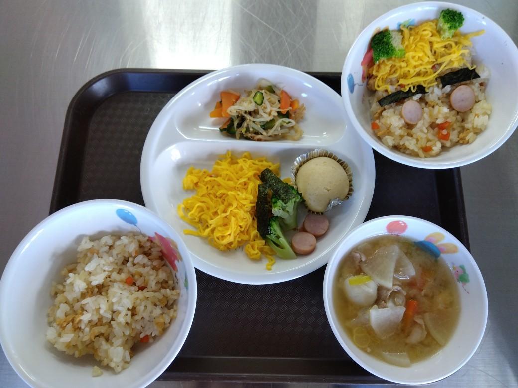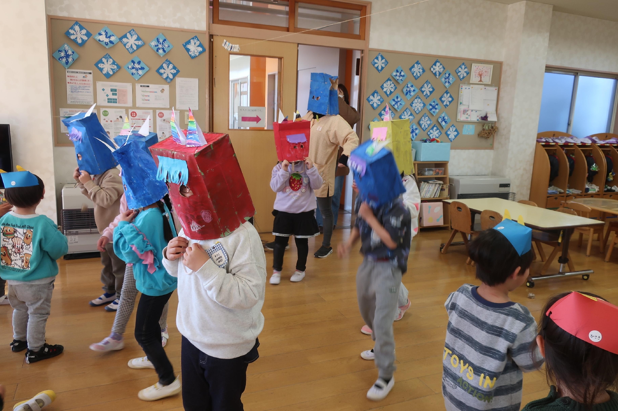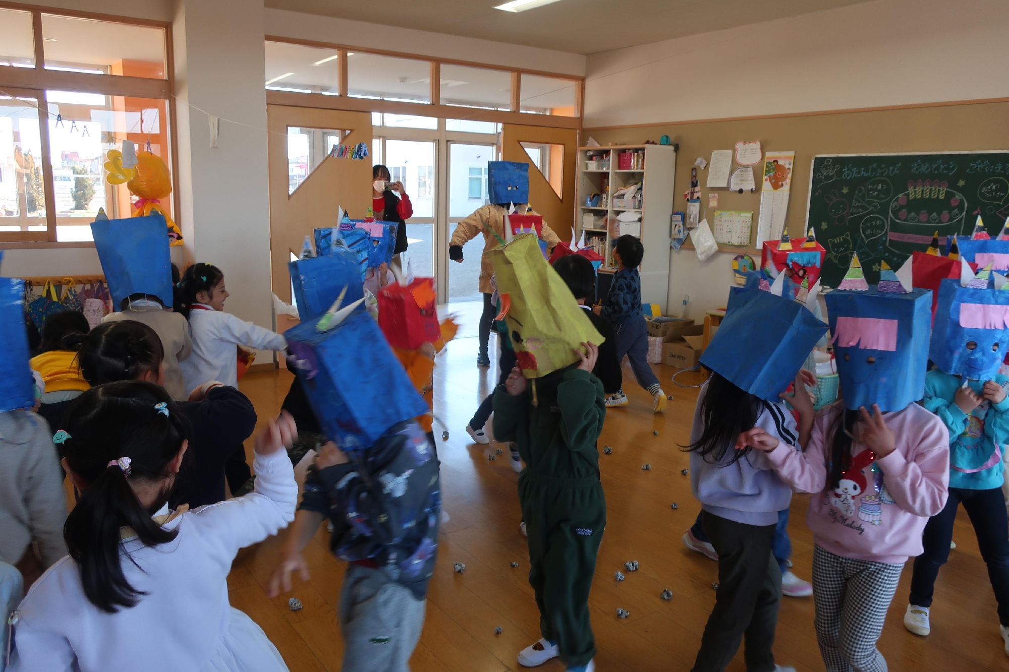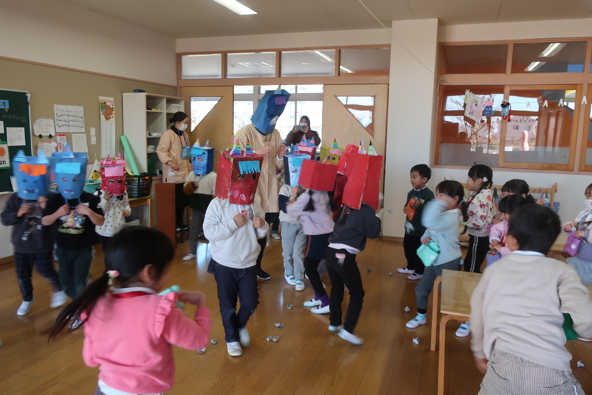 今日は節分、子供達が鬼になって豆もどきまきを楽しみました。誤嚥事故防止のため本物の豆は使いませんでしたが迫力のある鬼達に豆もどきを投げていました。給食は節分献立。自分で鬼の顔を作っていただく献立でした。飾って楽しく食べておいしい給食でした♪